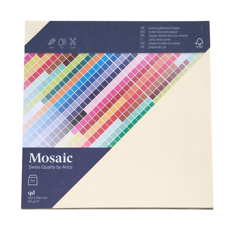 Erlebe die künstlerische Vielfalt des Mosaic Papiers von Artoz und lass deine Projekte in einem faszinierenden Mustermeer erstrahlen. Mit seiner großen Farb- und Formatauswahl ist es ideal für den Druck, perfekt zum Stanzen und Stempeln sowie für Origami und andere Falztechniken – für unendliche Gestaltungsmöglichkeiten und beeindruckende Kreationen. - Papier 90g/m² - Format: quadratisch, Umschlag, ungefüttert - Gerade Klappe mit Haftklebestreifen - Set mit 5 Stück im Cellophan Beutel - 160 × 160mm - FSC®- Zertifiziert